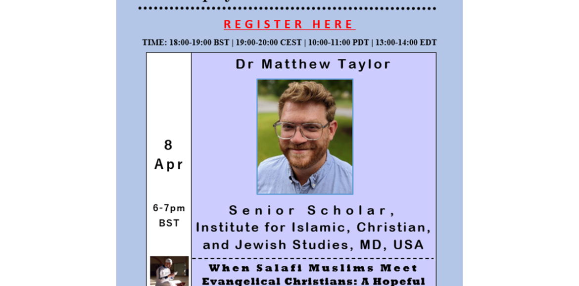 Speaker’s biography: Dr Matthew D. Taylor is a senior scholar and the Protestant scholar at the Institute for Islamic, Christian, and Jewish Studies in Baltimore, Maryland, USA, where he specializes in Muslim-Christian dialogue, evangelical and Pentecostal movements, religious politics in the U.S, and American Islam. Prior to coming to ICJS, Taylor served on the faculty of Georgetown University and The George Washington University. His first book, Scripture People: Salafi Muslims in Evangelical Christians’ America (Cambridge University Press, 2023), offers an introduction to the oft-misunderstood Salafi movement in the U.S. by way of comparison with American Evangelicalism. He is also the creator of the award-winning audio-documentary series “Charismatic Revival Fury: The New Apostolic Reformation,” which details how networks of extremist Christian leaders helped instigate the January 6th Insurrection. His second book, The Violent Take It By Force: The Christian Movement that is Threatening Our Democracy (Broadleaf Books), will be published in Fall 2024.